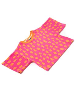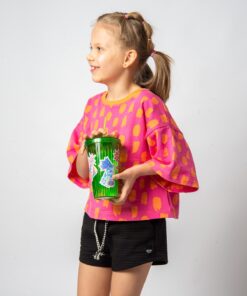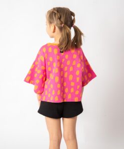 Blusa infantil de manga curta em moletinho jacquard 100% algodão. Possui a modelagem bem ampla, um pouco abaixo da cintura. Para as meninas mais descoladas do universo! Nossas peças tem as medidas maiores que o padrão do mercado, sugerimos comprar o tamanho equivalente à idade da criança.