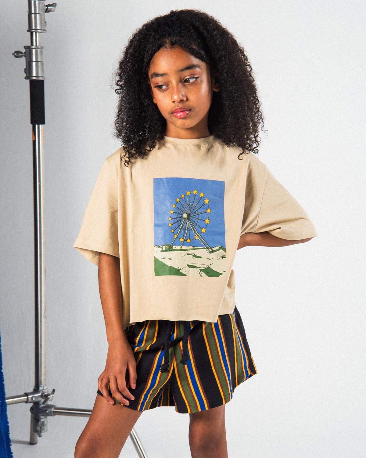 Blusa infantil em malha de algodão com estampa exclusiva de roda gigante, com modelagem ampla e comprimento na altura da cintura. Nossas peças tem as medidas maiores que o padrão do mercado, sugerimos comprar o tamanho equivalente à idade da criança.