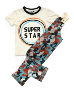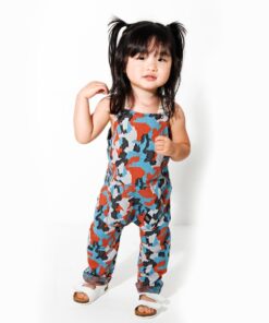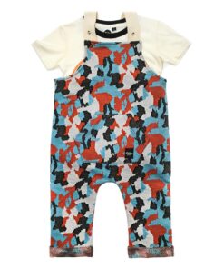Jardineira Unissex Camuflada para bebês e crianças em malha jacquard de algodão. Tem as alças de cadarço cru com regulagem, bolso canguru e bainha dobrada. Pode ser usada sozinha ou com blusa por baixo nos dias mais frios.