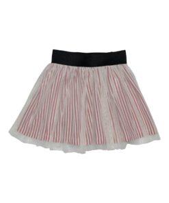 Saia com sobreposição de tecidos, possui elástico preto no cós, tem o forro de malha 100% algodão com listra exclusiva que é sobreposto por tule macio de poliamida. Para as meninas arrasarem com um look cheio de estilo!