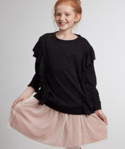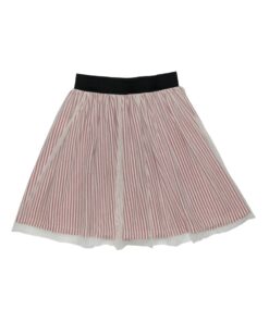 Saia para meninas em malha de algodão listrada e sobreposição de tule macio de poliamida. A melhor companheira das meninas mais descoladas! A modelo da foto mede 1,45m e está usando a saia tamanho 10.