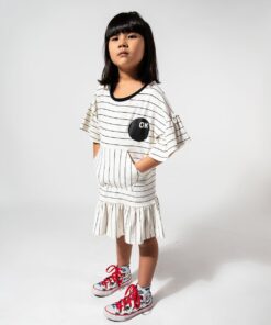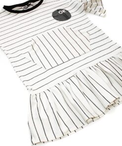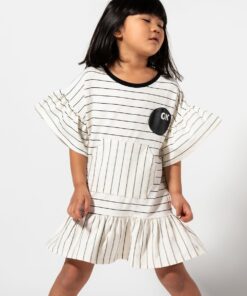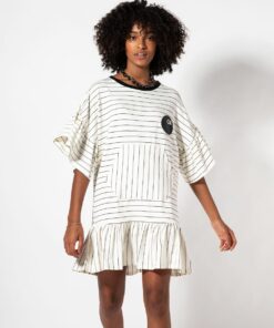 Vestido infantil em malha listrada de viscose com stretch. Com bolso canguru e estampa lateral, possui a modelagem ampla, evidenciada pelos babados franzidos. Para as meninas mais descoladas do universo! Nossas peças tem as medidas maiores que o padrão do mercado, sugerimos comprar o tamanho equivalente à idade da criança.