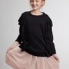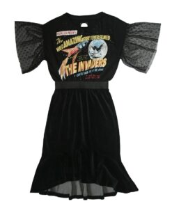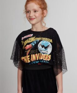 Vestido infantil com mix de tecidos: a blusa é em malha de algodão, as mangas em tule com bolinhas e a parte de baixo em plush, passando a idéia de ser saia e blusa, porém é tudo uma peça só! Tem tudo o que as meninas amam em um vestido, com a saia evasê que roda e ao mesmo tempo é super moderno e descolado com a estampa localizada inspirada em cartazes de filmes de ficção dos anos 50! A modelo da foto mede 1,53m e está usando o vestido tamanho 10.