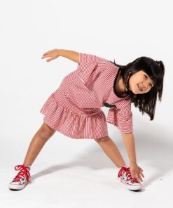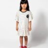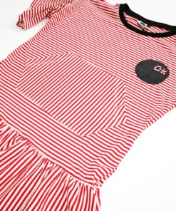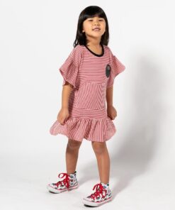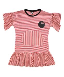 Vestido amplo infantil em meia malha de algodão listrada. Super moderno e descolado, tem mangas bem amplas franzidas, babadinhos na barra, bolso canguru e estampa lateral. Para as meninas mais estilosas da Galáxia! Nossas peças tem as medidas maiores que o padrão do mercado, sugerimos comprar o tamanho equivalente à idade da criança.
