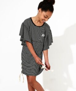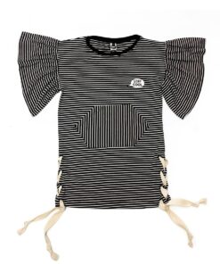Vestido infantil em malha listrada de viscose com stretch. Com modelagem estilo camisetão, possui as mangas amplas, evidenciadas pelo franzido e detalhe lateral na barra com tiras de gorgurão transpassadas . Nossas peças tem as medidas maiores que o padrão do mercado, sugerimos comprar o tamanho equivalente à idade da criança.